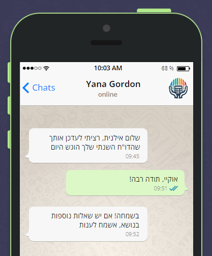 ניתן לשלוח חשבוניות וקבלות בכל דרך שנוחה לכם: פיזית, דרך WhatsApp או באמצעות כתובת מייל ייחודית המשולבת אוטומטית במערכת שלי.